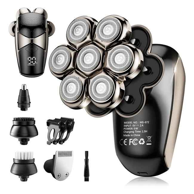 5in1 Electric Razor for Bald Men - Shpavver Detachable Head Shavers - IPX7 Waterproof - LED Display - Rechargeable 7D Rotary Shaver