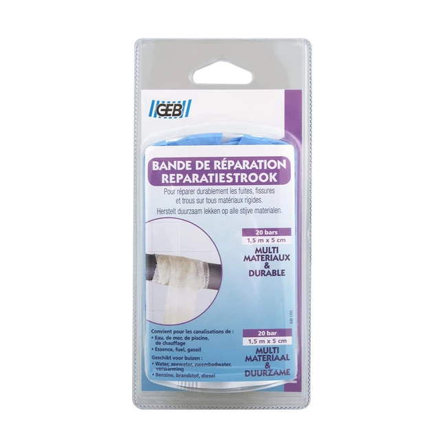 -11%Rparez durablement fuites, fissures, trous sur tous supports rigides avec la bande en fibre de verre enduite de rsine polyurthane de GEB. Performant, fiable et durable sur tous matriaux rigides. Application sur surfaces humides et en immersion jusqu' 1m de profondeur. Compatible avec eau, fuel, gasoil, essence, eau de mer, chauffage, piscine. Peut tre peint. Durcit en 30 minutes. Rsiste 125C en continu et 20 bars de pression. Dimensions: 15m x 5cm. GEB, la rfrence en tanchit depuis 1860.