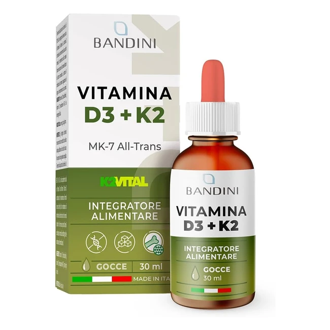 Bandini Vitamina D3 K2 Gocce - Olio Extra Vergine di Oliva - 1000 UI per Goccia - Vit K2 MK7 Menachinone - 100 mcg per Goccia