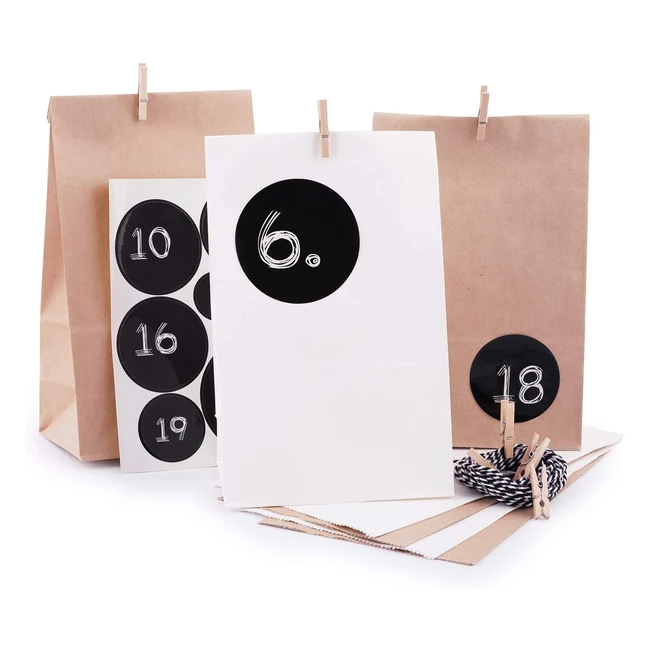 ¡Aprovecha esta oportunidad! Calendario de Adviento Pajoma de papel biodegradable. Incluye 24 bolsas de papel kraft, 24 mini pinzas de ropa y adhesivos numerados. Ideal para joyas, dulces y figuras pequeñas. ¡No te lo pierdas!