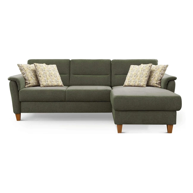 -4%Jetzt zugreifen! Cavadore Ecksofa Palera - Federkernsofa mit Holzfüßen im modernen Design für das Wohnzimmer. Inklusive passendem Beistellhocker. Hoher und langlebiger Sitzkomfort dank Federkern und hochwertigen Polsterschäumen. Pflegeleichter Chenillestoff in Grün. Maße: 244x89x163 cm (BxHxT). Sitzhöhe: 48 cm, Sitztiefe: 52 cm, Füße: 12 cm. Rücken echt bezogen und frei im Raum stellbar. Made in Europe für hohe Qualität und kurze Transportwege.