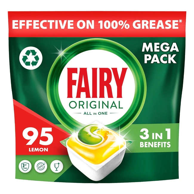Experience 1st time cleaning action with Fairy All-in-1 Lemon Dishwasher Tablets. These tablets are effective even on dried-on grease, with built-in salt and rinse aid action for glass and silver protection. Keep your dishwasher smelling fresh and clean. The ultra-soluble tablet dissolves fast for a sparkling clean every time.