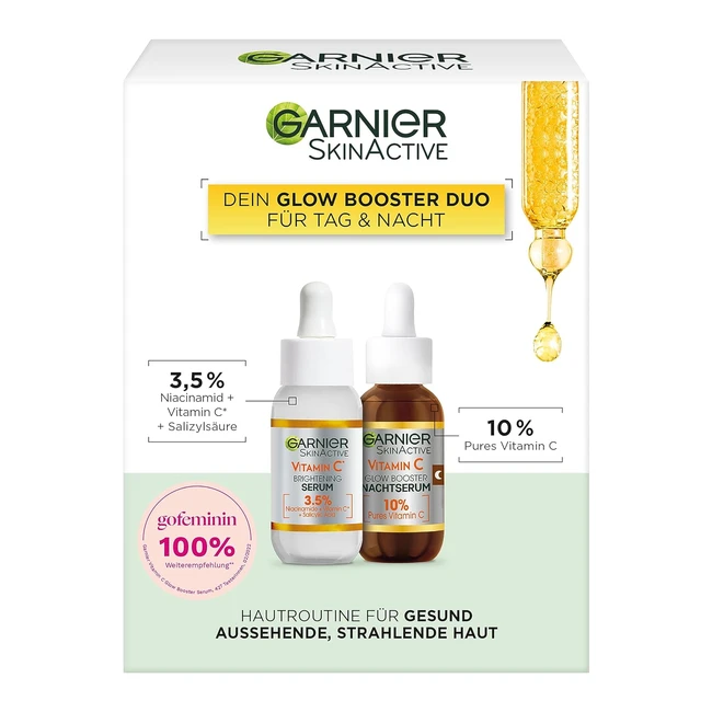 Über dieses Produkt: Glow Booster Serum Duo mit Vitamin C Serum gegen dunkle Flecken für den Tag und regenerierendem Vitamin C Nachtserum für die Nacht. Geeignet für alle Hauttypen. Ergebnis: Reduzierte Pigmentflecken, verfeinerte Poren und strahlender, gleichmäßiger Teint. Glattere, revitalisierte und regenerierte Haut nach nur einer Anwendung. Anwendung: Tragen Sie eine Ampulle des Anti-Dunkle-Flecken-Serums auf das Gesicht auf und massieren Sie es ein. Tragen Sie 3-4 Tropfen des Nachtserums auf das Gesicht und den Hals auf und massieren Sie es ein. Vitamin C Serum für den Tag mit 3,5% Niacinamid, Vitamin C und Salicylsäure sowie passendes Nachtserum mit 10% reinem Vitamin C und Hyaluronsäure. Vegane Formel. Lieferumfang: 1 x Garnier SkinActive Vitamin C Serum gegen Pigmentflecken, 1 x Garnier SkinActive Vitamin C aufhellendes Nachtserum.