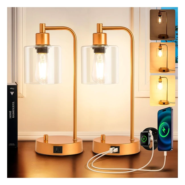 Homelist Table Lamp Set of 2 Dimmable Small Gold Industrial LED Table Lamps #USB Charging Port Glass Shade