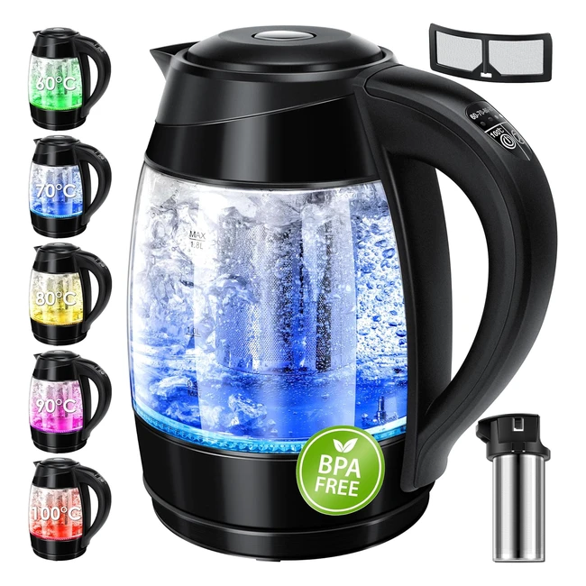 2200 Watt Edelstahl Glas Wasserkocher mit 18 Liter Fassungsvermögen ohne Piepton gebürstet aus hochwertigen Edelstahlelementen geschmacksneutral Glas 100 % BPA-frei Farbwechsel bei eingestellter Temperatur 60 70 80 90 und 100 Grad inkl. herausnehmbarem Teesieb wiederverwendbarem Kalkfilter für Tee Kaffee Babynahrung uvm. Warmhaltefunktion für insgesamt 2 Stunden bei ausgewählter Temperatur o leicht zu reinigen spülmaschinengeeignet Teesieb Heizelement abgedeckt automatische Abschaltung tropffreier Auslauf dank Form des Serviergriffs Überhitzungsschutz kabellos abnehmbarer Wasserkocher für Rechts- und Linkshänder hitzeisolierte Tragegriff 0,7 m Kabellänge Breite 23 cm Tiefe 16 cm Höhe 23 cm