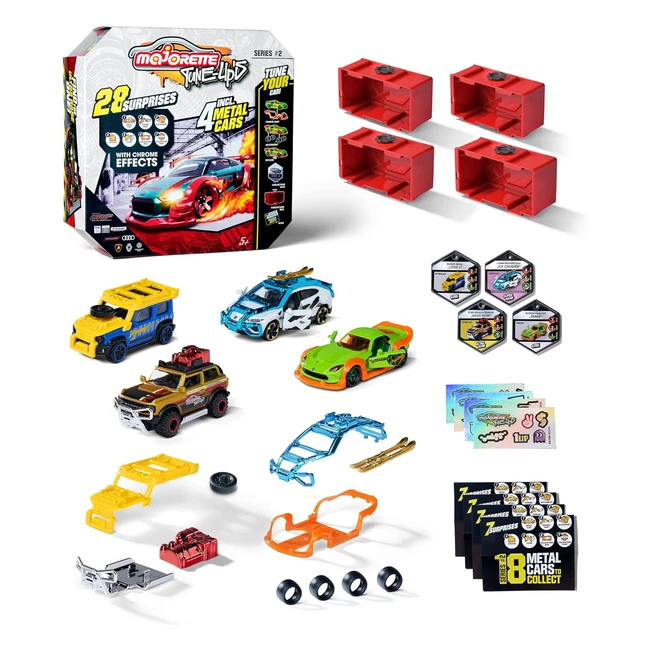 Majorette Tune Ups - Coches de Metal para Tunear Pack 28 Sorpresas - Incluye 4 Coches y Accesorios de Tuning