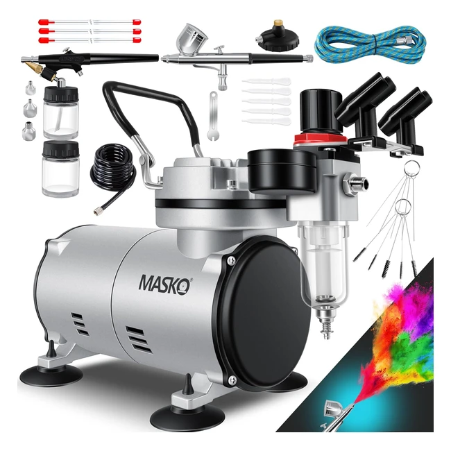 Masko Airbrushset mit Kompressor 4 Bar inkl. Airbrushpistolen, Lackierpistole, Komplettset, Tattoo Kunst Malerei, Nadeln, Düsen, Zubehör