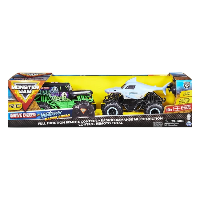 -20%Race the Grave Digger against the Megalodon and see who will come out on top! These official 124 scale Monster Jam RC trucks are built to perform. Batteries included for instant action. Race from up to 60 meters away with 2.4GHz frequency. Build your own arena with 8 custom race track pieces. Authentic replica trucks with power, attitude, and excitement. Perfect for boys and girls ages 4 and up. Only available on Amazon.