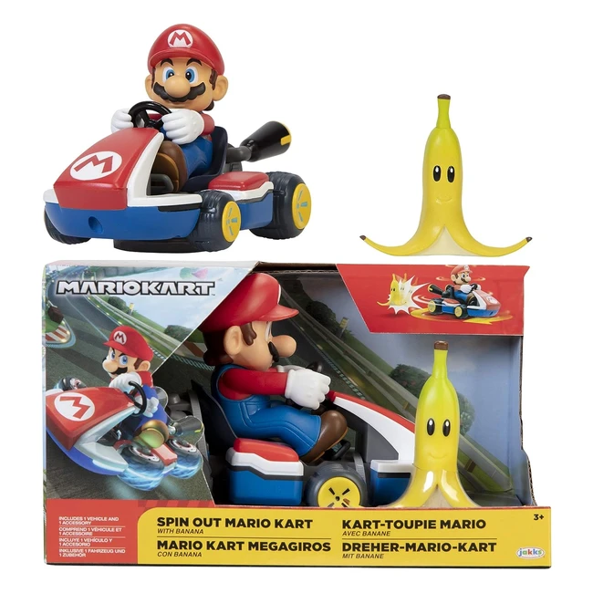 Race anywhere with this MarioKart Racer! Front and back triggers activate spin out feature, 360 spins, wind up and go. Complete your collection with Spin Out Mario Kart Luigi. Includes Mario Kart and banana accessory. Suggested for ages 3+. Order now for fast shipping!