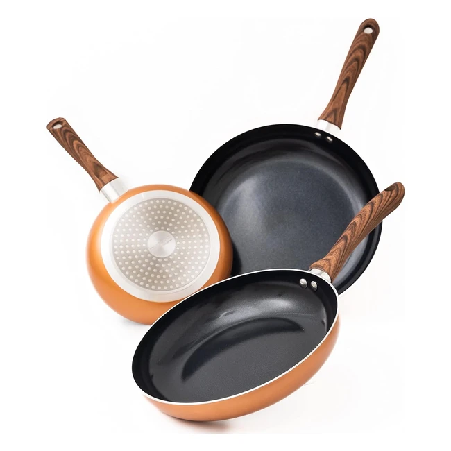 Nuovva Copper Frying Pan Set - Nonstick Coated Stainless Steel - Induction - Anti-Scratch - Wooden Handle - PFOA Free - 3pcs