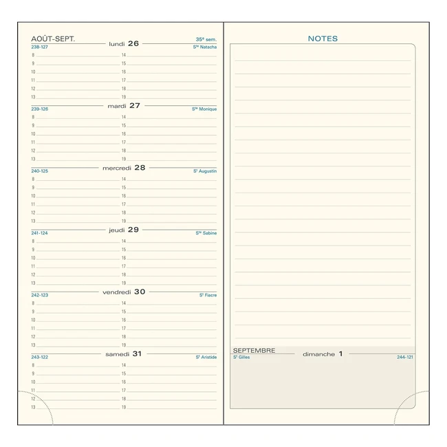 Recharge semainier pour agenda Exacompta 17840E - Consultez votre semaine en un coup d'œil, avec des horaires de 8h à 19h du lundi au samedi. Édition française avec reliure brochée pour une meilleure solidité. Impression en bleu et gris sur papier ivoire clairefontaine pour une écriture douce et fluide. Tranche dorée et coins détachables pour un accès rapide à la semaine en cours. Inclus calendriers semestriels, planning annuel, codes départementaux, répertoire téléphonique et plus encore. Certifié PEF et Imprim'Vert. Fabriqué en France.
