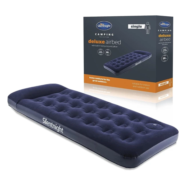 Get the Silentnight Deluxe Airbed Single for a comfortable camping experience. Built-in foot pump for easy inflation. Raised pillow for improved head and neck support. Compact and durable design. Buy now and enjoy a good night's sleep!