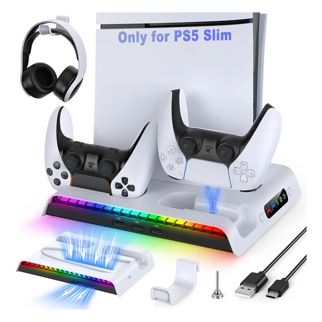Station de stockage d'accessoires PS5 Slim avec ventilateur turbo efficace, support de chargement pour manette et casque. Fonctions de chargement et de refroidissement combinées pour répondre à tous vos besoins. Compatible uniquement avec PS5 Slim console disc/digital CFI2000. Station d'accueil pour le chargement de deux manettes avec protection intelligente contre les surintensités, surtensions et surchauffes. Réglage du port USB de la console pour une alimentation continue. Effet lumineux RGB avec 9 options de couleurs vibrantes. Ventilateur silencieux et efficace pour une meilleure circulation de l'air et une expérience de jeu plus stable. Support multifonctionnel avec 3 ports USB supplémentaires pour le transfert de données. Accessoire indispensable pour améliorer votre expérience de jeu.