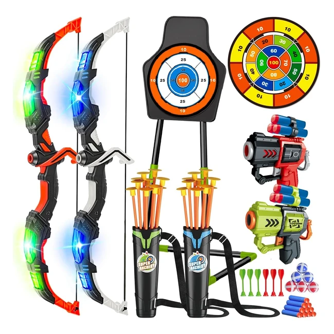 -6%Offrez 2 cibles de tir polyvalentes 2 arcs lumineux avec 20 flches 2 carquois ajustables 2 pistolets de tir 20 flchettes en mousse 10 ventouse et 10 collantes 6 balles collantes. Idal pour dvelopper la coordination et l'imagination des enfants. Jouez l'intrieur ou l'extrieur pour des moments de partage en famille.