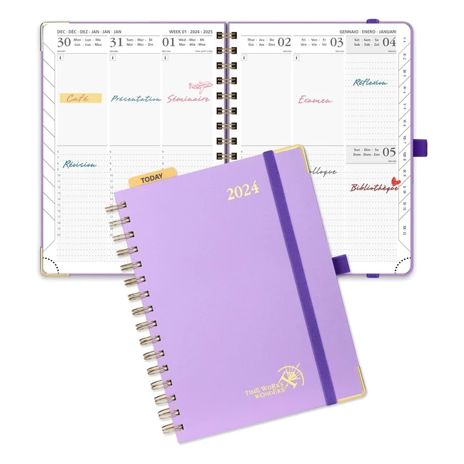 Agenda Poprun 2024 A5 Semainier - Format 215 x 16 cm - Planner Vertical - 12 Mois de Jan 2024 à Déc 2024 - Couverture Rigide - Spirale - Poche Intérieure - Papier Certifié FSC100g - Violet