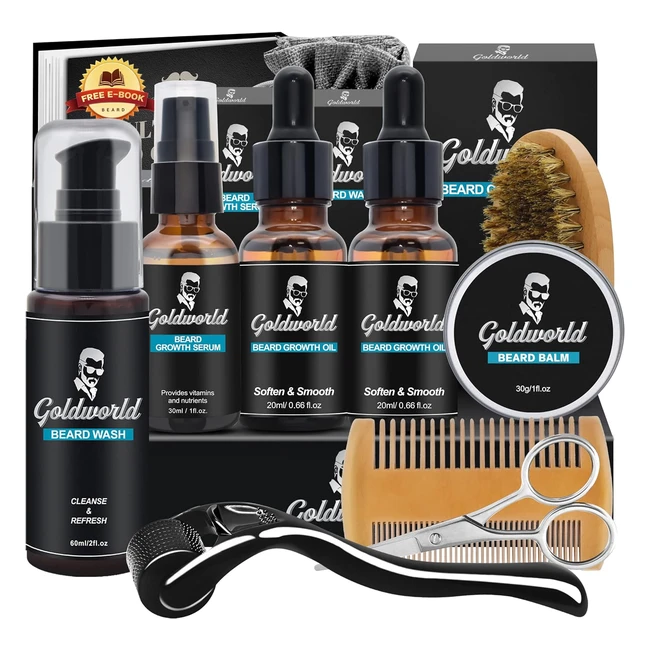 Beard Growth Grooming Kit for Men - w/Derma Roller - Hair Growth - Birthday Christmas Gifts - Set for Him - Stocking Fillers - Mens Dad Boyfriend Husband - w/Beard Oil, Beard Wash, Shampoo, Balm, Wax - Comb, Brush