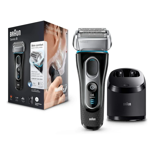 Braun Series 5 Electric Shaver - Precision Trimmer, Clean & Charge Station - 100% Waterproof - UK 2 Pin Plug - Black/Blue