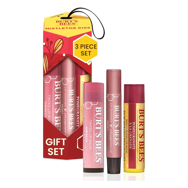 The perfect Christmas gift for women! This lip balm set is beautifully packaged in a festive gift box, ready for holiday gifting. Get naturally moisturized, soft, and healthy lips with Burts Bees Mistletoe Kiss Gift Set. Includes a pomegranate lip balm, a tinted lip balm in hibiscus shade, and a lip shimmer in peony shade. Enriched with responsibly sourced beeswax, antioxidant-rich vitamin E, and nourishing shea butter to moisturize and hydrate dry lips. Pomegranate oil gives a sweet fruity flavor. Enhance the natural look of your lips with the warm neutral hue of the hibiscus tinted lip balm. The peony lip shimmer leaves a luminous finish with a slight beige mauve tint. Recyclable packaging made from FSC certified 50% post-consumer recycled card. Gift packaging is 100% recyclable.