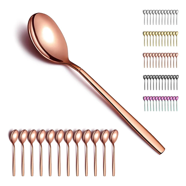 12 Cucchiai da Tavola Oro Rosa lucido rivestiti in titanio, durevoli e senza ruggine. Acciaio inossidabile resistente, bordo liscio e lucido a specchio. Perfetti per feste, matrimoni, compleanni. Facili da pulire, buona presa, lussuosa placcatura in titanio oro rosa. Adatti per uso quotidiano, lavabili in lavastoviglie. Design elegante e senza tempo, adatti per eventi formali e pasti quotidiani. Ben bilanciati per una presa salda. #CucchiaiOroRosa #AcciaioInossidabile #Titanio #Feste #Matrimoni #Lavastoviglie #DesignElegante #CasaRistorazioneHotel #Compleanni