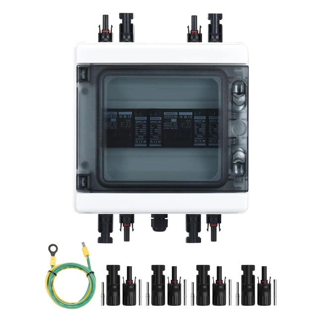 Hochwertiger Überspannungsschutzanschlusskasten aus PC/ABS Technischen Kunststoffen. IP65 wasserdicht und staubdicht. Antiultraviolett und flammhemmend. Transparentes Sichtfenster. Austausch des Blitzschutzmoduls bei Blitzschlag. Standard Blitzschutzchip. Leistungsschalter 40A DC500V. Silberkontakte. Flammhemmende Schale. Direkte Verdrahtung durch wasserdichte Steckverbinder und Klemmen. Plug-and-Play Solarstecker. Technische Daten: 2 Strings DC500V, IP65 wasserdichtes Gehäuse, Überspannungsschutz DC 500V 2P 20kA 40kA, PV Sicherungsautomat 2 polig DC500V 40A.