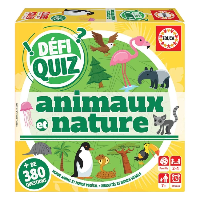 Découvrez le monde avec le jeu familial éducatif Educa Défi Quiz Animaux et Nature! Répondez aux questions et apprenez des infos intéressantes et rigolotes. Plus de 380 questions réparties en 4 catégories: avion, train, bateau, appareil photo. Contient 96 cartes, 1 plateau de jeu, 1 plateau des catégories, 16 jetons valises, 4 jetons joueurs. Règle du jeu incluse. Achetez maintenant!