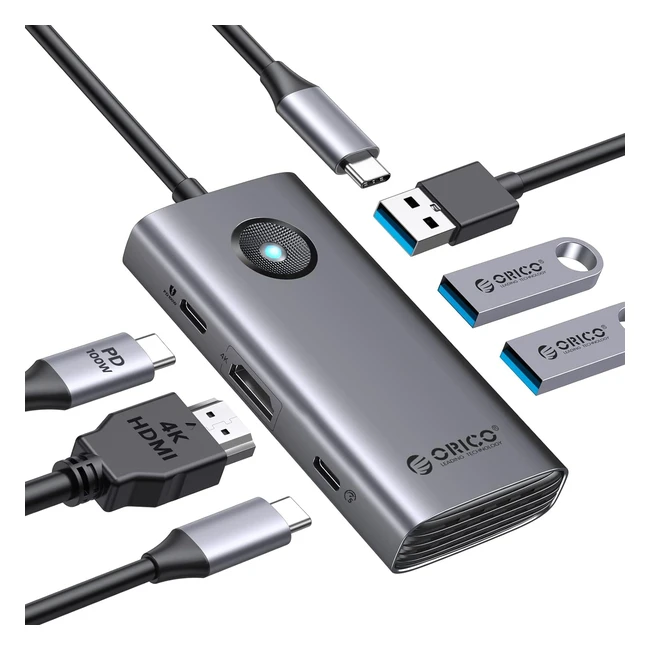Estación de Acoplamiento Orico 6 en 1 con HDMI 4K PD100W, USB-A 3.0, USB-C 3.0 - Gris
