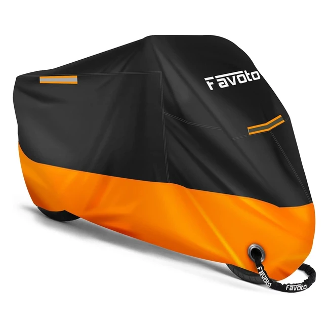 -10%High-quality Favoto motorcycle cover made of 210D polyester fabrics. Protects against rain, heat, dust, sun, and scratches. Lockhole design with antitheft feature. Adjustable tie-down straps. Universal fit for motorcycles up to 965 in length. Includes 3 night reflective stickers. Easy storage with a storage bag.