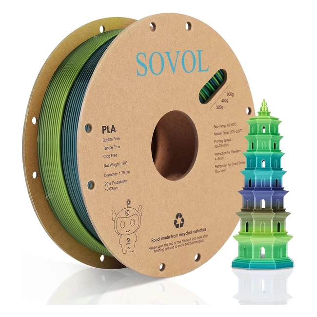 Filamento PLA di seta multicolore SOVOL Rainbow 175mm 1kg 22lbs 003mm verde arcobaleno