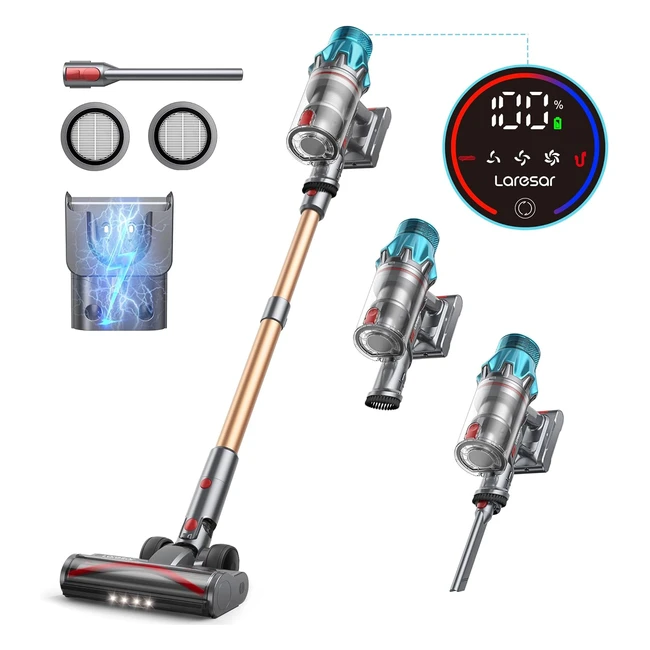 Découvrez le puissant aspirateur sans fil Laresar 2024 avec moteur 550W et 45Kpa d'aspiration. Autonomie de 60min, batterie amovible et rechargeable. Ecran tactile, 3 modes pour tous les besoins. Brosse motorisée V pour moins d'enchevêtrement. Garantie 2 ans.