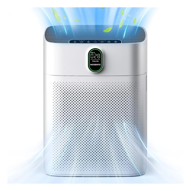 Doppelseitige Luftzufuhr, hocheffiziente Filtrierung, PM2.5 Display, leiser Partner, 3 Timer, 4 Luftgeschwindigkeiten. Sicherheit und Vertrauen mit Morento Luftreiniger.