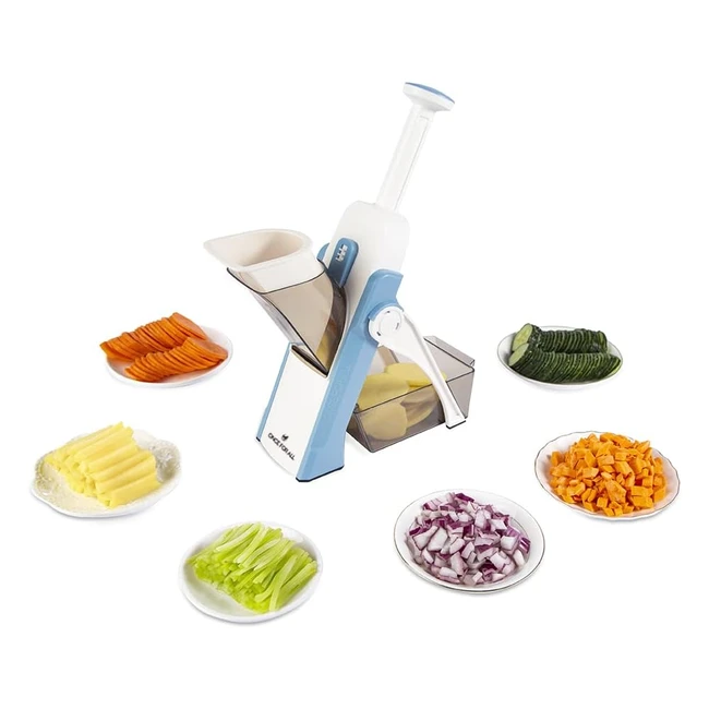 Safer vegetable slicer once for alls mandolin with concealed blades designed to keep hands and fingers away from the blades for an easier and safer way to cut. The springloaded handle jumps upwards so press down to cut in seconds. Versatile mandoline slices julienne cubes and more for easy meal prep with 40 different preset cuts for different adjuster thicknesses 0.18mm. Easy to clean compact foldable design for easy storage. Perfect gift for moms, professional chefs, cooks, healthy-conscious individuals, and others. Box includes safe mandoline vegetable slicer, food container, cleaning brush, instruction manual, and 24-month warranty.