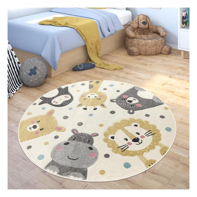 Paco Home Teppich Kinderzimmer Kinderteppich Waschbar Junge Mädchen Spielteppich Rund Modern Zootiere Größe 200 cm Beige