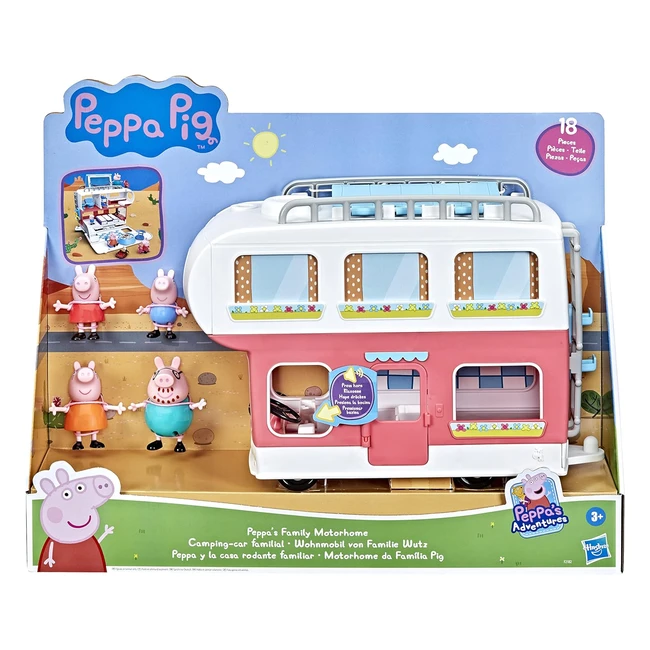 Erleben Sie mit dem Wohnmobil von Familie Wutz einen aufregenden Urlaub mit Peppa Pig und ihrer Familie. Das Fahrzeug kann in einen mehrstöckigen Peppa Pig Caravan verwandelt werden und bietet damit spannenden Spaß. Enthält 4 Figuren der Familie Wutz und 13 Zubehörteile wie eine bewegliche Küche, ein Lagerfeuer und sogar eine Toilette. Alle Zubehörteile können im Fahrzeug verstaut werden. Mit abnehmbaren und interaktiven Accessoires wie einem Pool, der zu einem Tisch wird, einem Sonnendach, das hochgeklappt als Hängematte dient, einem klappbaren Doppelstockbett und einem zu öffnenden Ofen. Genießen Sie die bekannte Musik und die Stimme von Peppa Pig aus der Serie. Ein oinktastisches Geschenk für Geburtstage oder Weihnachten für Vorschulkinder ab 3 Jahren. Entdecken Sie auch andere Peppa Pig Spielzeuge und Fahrzeuge von Hasbro, wie Peppas Tag- und Nacht-Haus (separat erhältlich, je nach Verfügbarkeit). Weitere Produktdetails finden Sie unten.