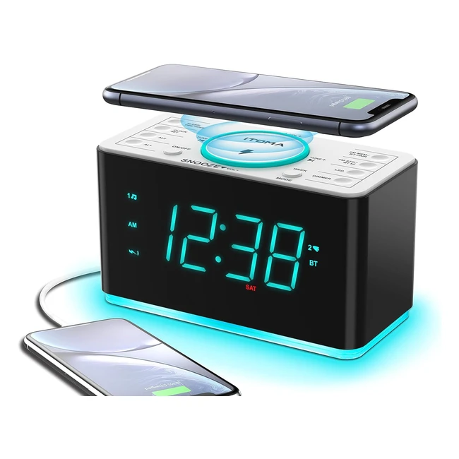 Radio Réveil Chargeur Sans Fil Ultra Rapide 15W avec Bluetooth USB Double Alarme Minuterie Sommeil Snooze FM Radio LED Cyan 14 pouces Itoma CKS207