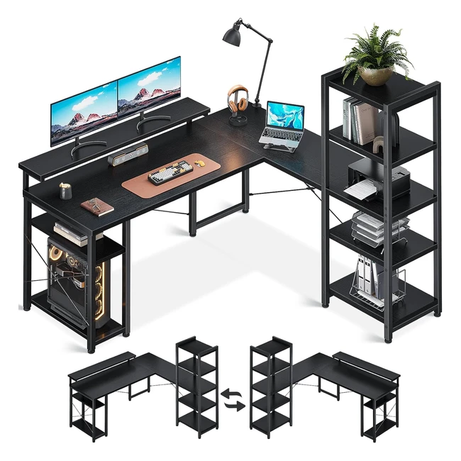 Scrivania ad angolo reversibile ODK con libreria - Spazio di lavoro ampio e supporto per monitor regolabile