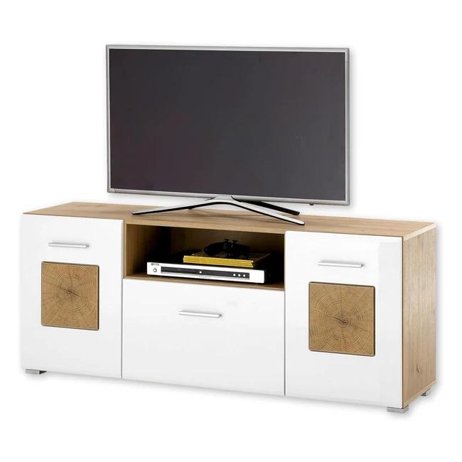 -15%Jetzt zugreifen! Modernes TV Lowboard mit viel Stauraum für Multimedia-Geräte. Hochglanz weißer Eichenlook mit natürlicher Note. Einfache Montage. Perfekt für dein Wohnzimmer.