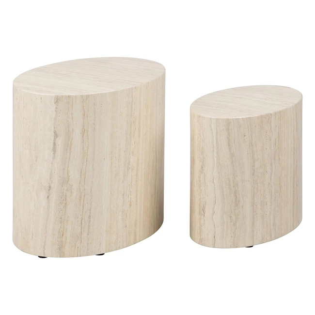 -13%Ensemble compact de 2 tables de salon pour une ambiance harmonieuse et paisible. Bords doux, forme ovale flatteuse. Tables travertin cote a cote ou separees. Corps en bois, surface en papier durable. Petite table cachee dans la grande. Dimensions: 48 x 40 x 33 cm et 40 x 33 x 245 cm. Charge maximale 20 kg.