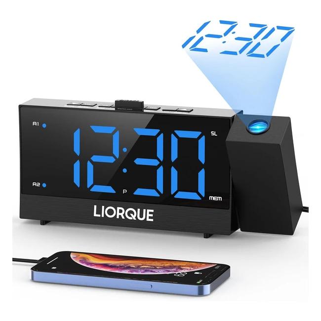 Liorque Projection Alarm Clock Bedside Digital LED Projection Clock FM Radio USB Charger