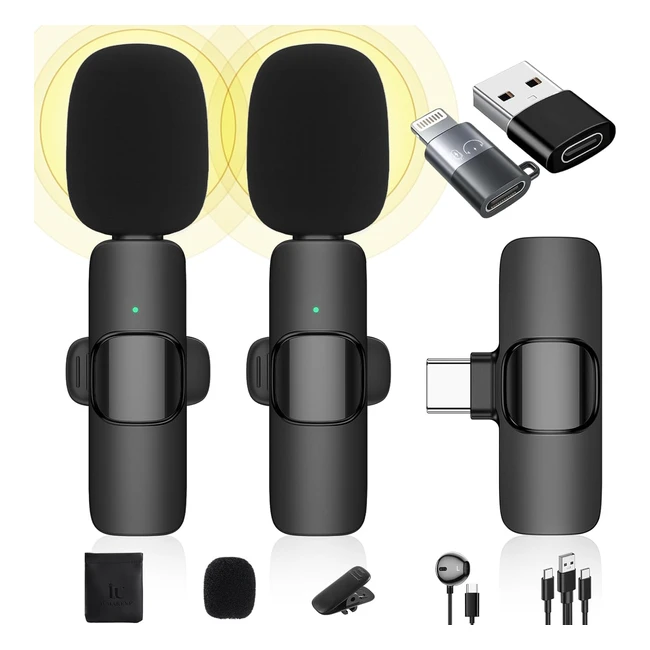 Microfono Wireless per iPhone/ iPad/ Telefono Android/ Laptop iumakevp - Plug and Play, Riduzione del Rumore, Registrazione Video, Live Stream, Interviste, YouTube, TikTok, Facebook - 2 Mics