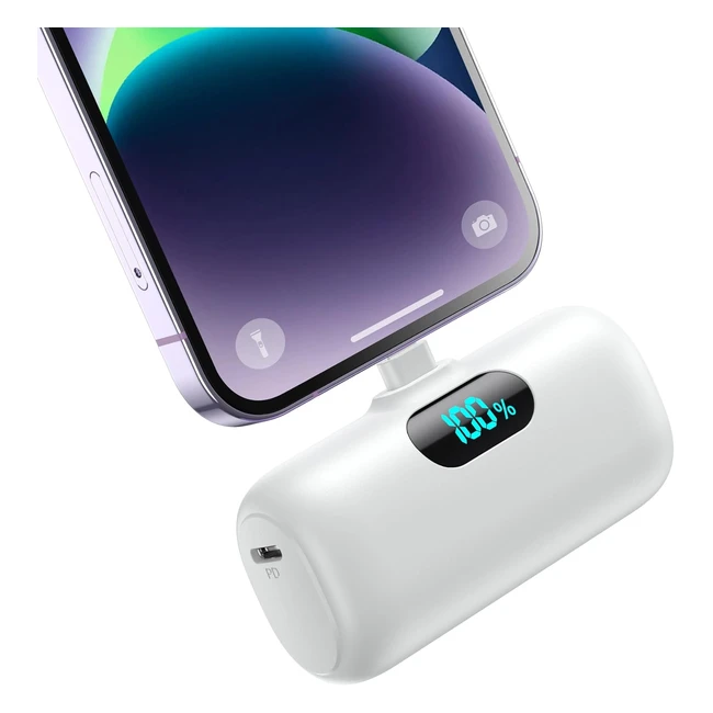 Mini Cargador Portátil iPhone 5000mAh PD 15W - Pequeño y Ligero - Powerbank con Pantalla LED - Compatible con iPhone 14/14 Pro/13/12/11/XS - Blanco