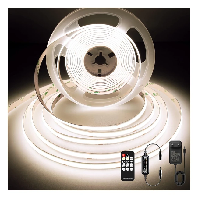 -5%Ruban LED COB avec 2400 puces LED, luminosité continue, efficacité lumineuse élevée, angle de faisceau de 180. Idéal pour décoration maison. Livré avec alimentation et télécommande.