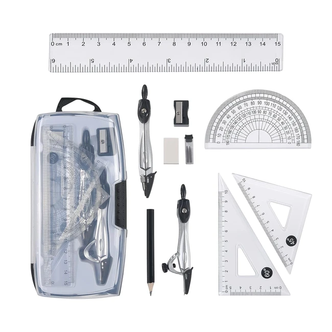 -5%Complete geometry tools set with 2 compasses, protractor, set squares, ruler, pencil, eraser, sharpener. Ideal for school, engineers, and math enthusiasts. Perfect for drawing circles up to 10 diameter, precise measurements, and exams. Durable materials, smooth writing, and easy erasing. Convenient carry case for students and professionals. A must-have math learning tool and a thoughtful gift for teachers, engineers, designers, and artists.